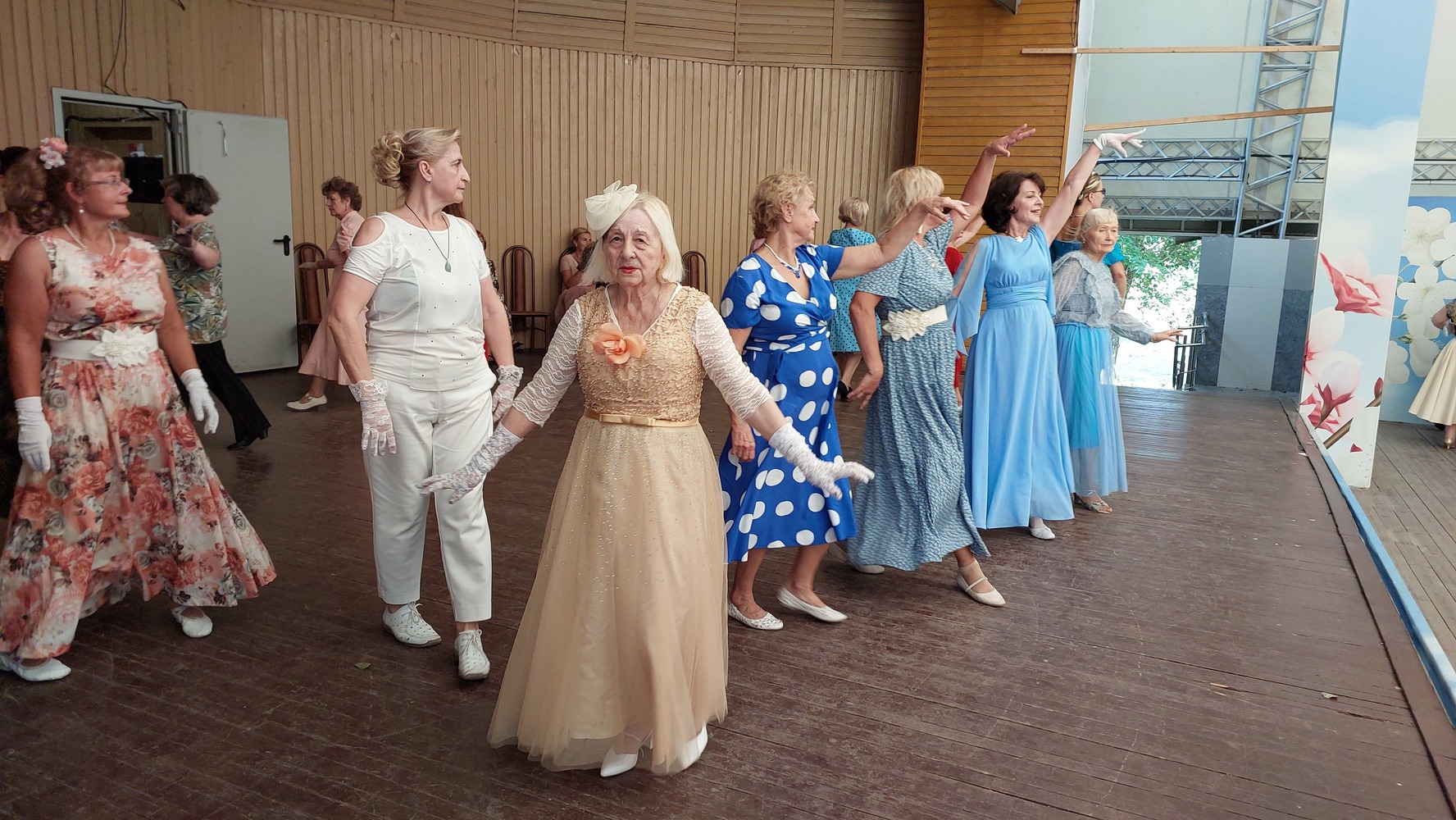 Cada sábado, decenas de enérgicos bailarines, la mayoría de ellos mayores de 60 años, se reúnen aquí para mostrar su destreza. Visten atuendos elegantes: las damas con vestidos, sombreros y guantes, y los caballeros con camisas extravagantes y pajaritas. El repertorio impresiona por su diversidad, con hasta 55 tipos de bailes, incluyendo valses clásicos, tango, mazurca, polka, rumba, así como los bailes folclóricos “Sudarushka” y “Tarantella Pulcinella”. Atraídos por la música rítmica, incluso los turistas chinos, acostumbrados a este tipo de escenarios de baile al aire libre, se unen con agrado al espectáculo.